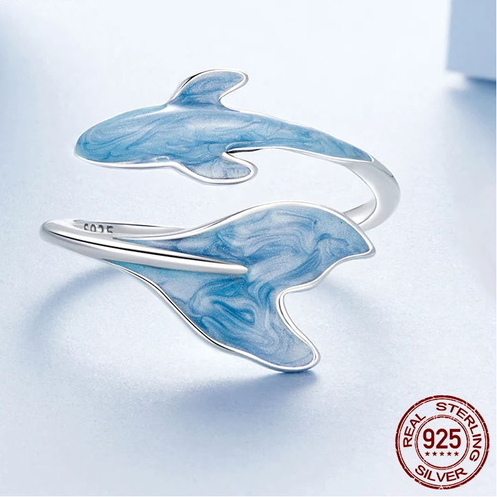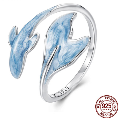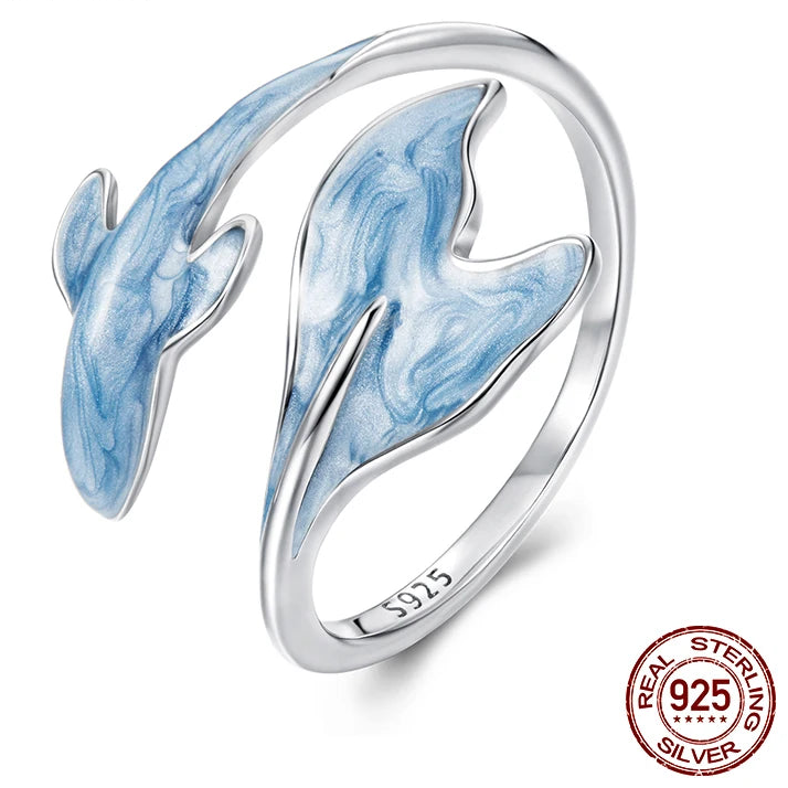 Crafted in 925 sterling silver, this adjustable open ring features a delicate guppy design with blue accents that shimmer like the ocean itself.