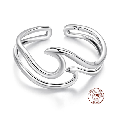 Crafted in 925 sterling silver, this adjustable open ring features a sleek double-wave design that symbolizes connection and flow.